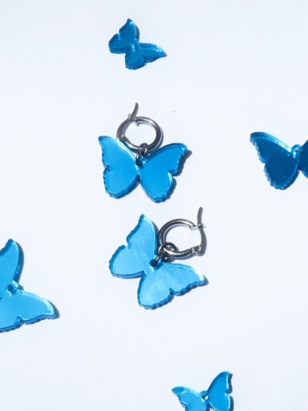 Dijes en acrilico celeste espejado con forma de mariposa, en argollas de acero quirurgico.