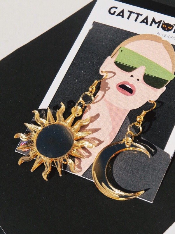 Aritos colgantes en acrilico dorado espejado con forma de luna y sol, grabados en laser. Los pasantes no son de acero quirúrgico.